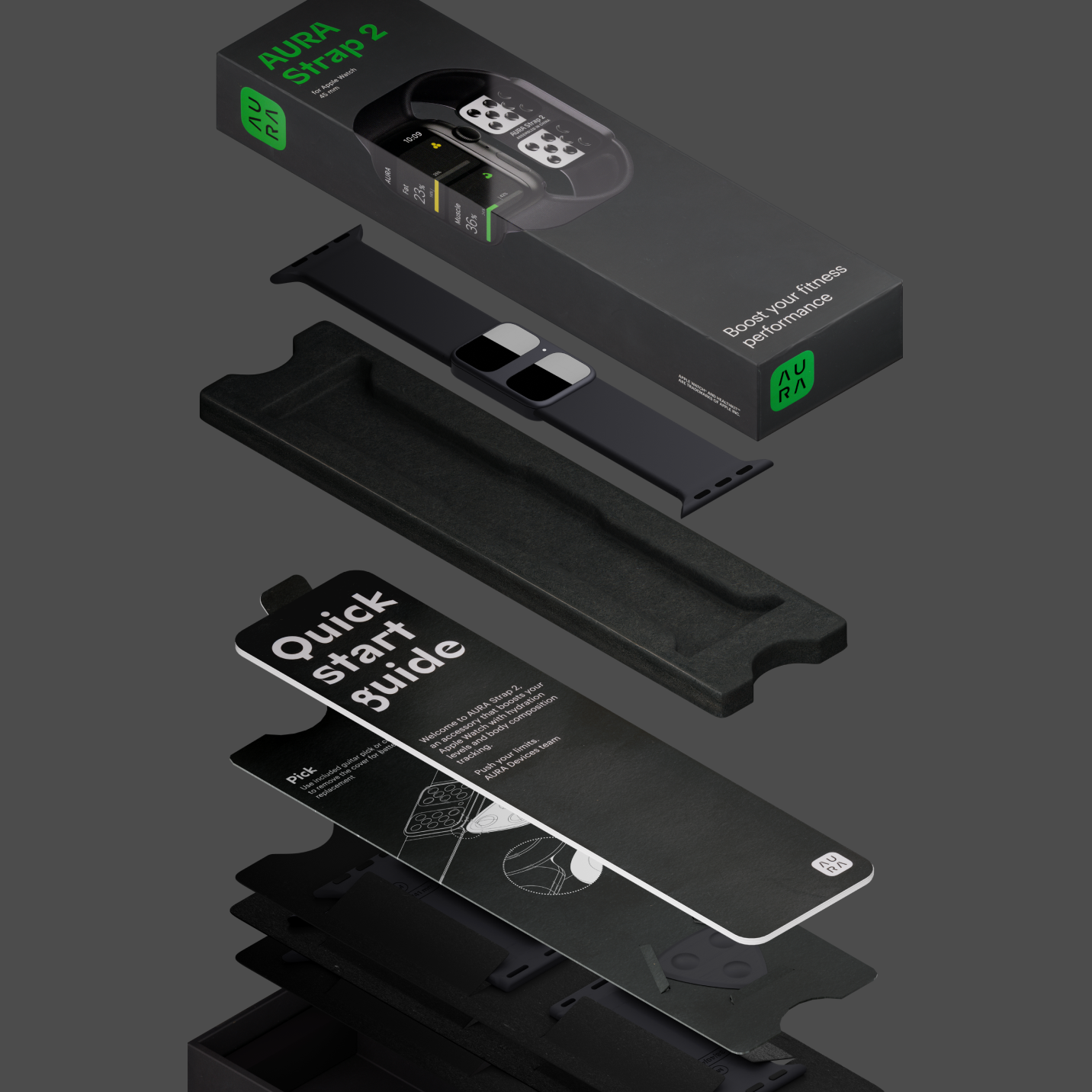 AURA Strap 2 with battery, Infinite Loops in M, L, XL and XXL sizes, pick for battery and loop replacement, quick start guide.